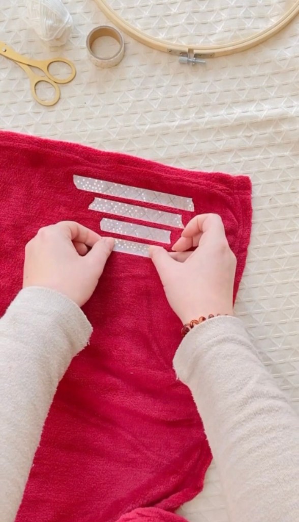3. Réalisez la broderie à l’aide de fils blanc et d’une aiguille. Pour cela, faites un point de croix en suivant la largeur du masking tape.