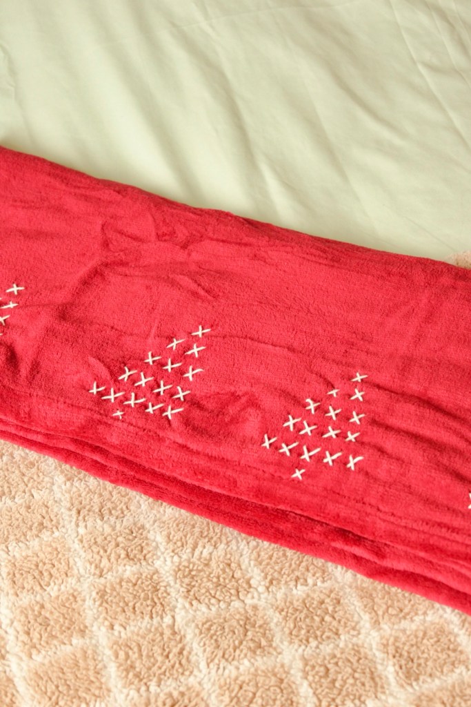 7. Continue ainsi sur toute la longueur du plaid, en espaçant de quelques centimètres, chaque sapin brodé.