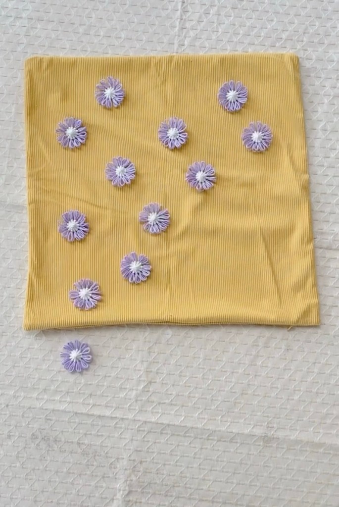 3. Placez chaque fleurs sur la housse, en quinconce et cousez-les à l’aide du fil et d’une aiguille.